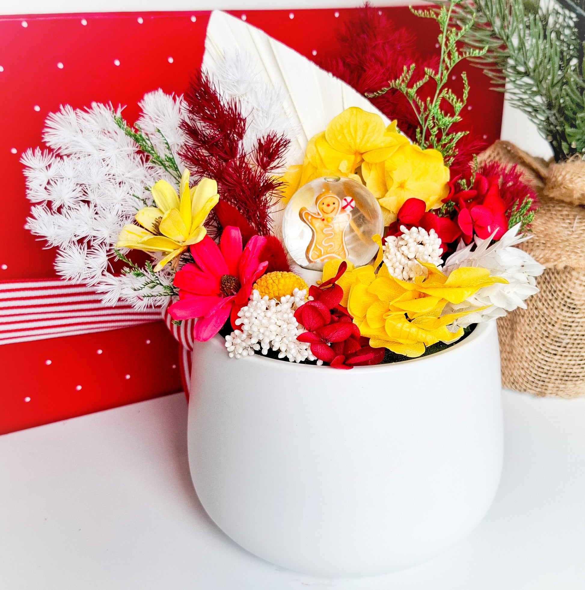 Arranged in a large white ceramic pot, this statement piece features stunning red, white, and yellow dried florals, beautifully balanced to bring warmth and joy to your festive décor. Nestled among the blooms is a whimsical gingerbread man snow globe, adding that perfect touch of Christmas wonder.