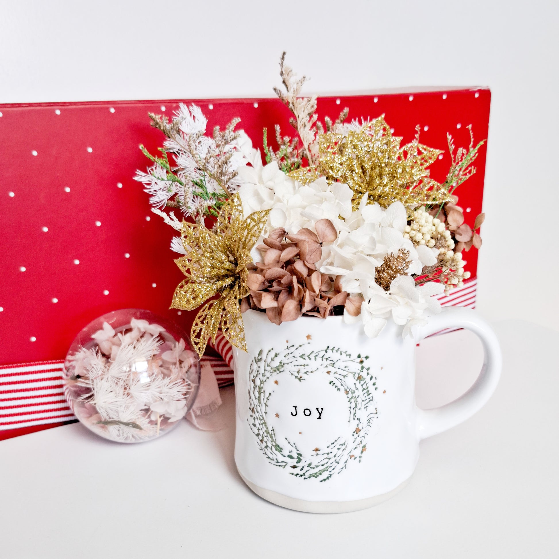 Celebrate the simple beauty of the season with our Joy Dried Floral Arrangement. Nestled in a charming white mug with an intricate design and the word Joy etched across the front, this piece captures the heart of a calm and peaceful Christmas.