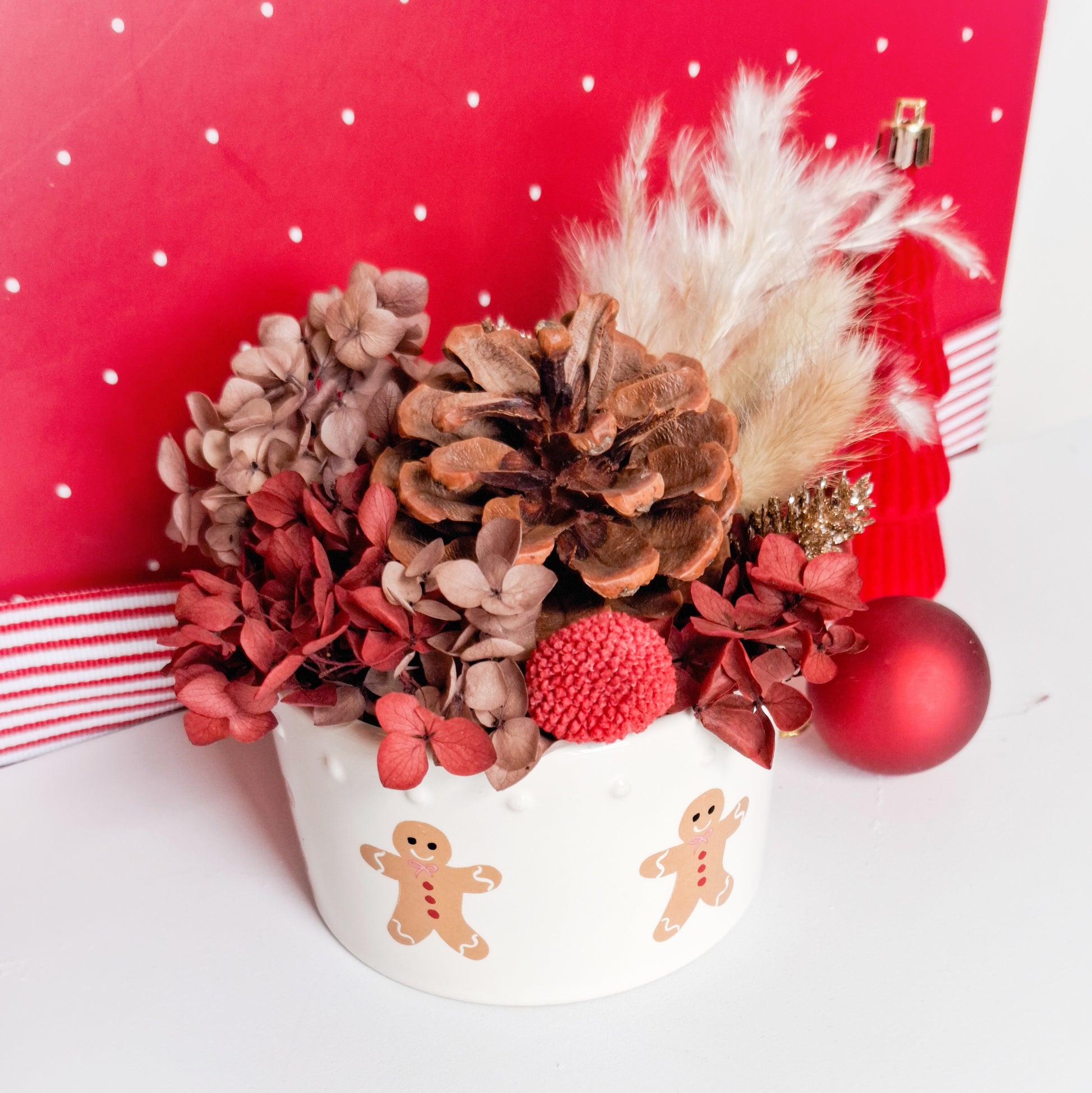 Bring the warmth and nostalgia of the festive season into your home with our Gingerbread Dried Florals. Nestled in sweet cream-coloured vessels adorned with charming gingerbread designs, each arrangement captures the magic of Christmas with everlasting beauty.